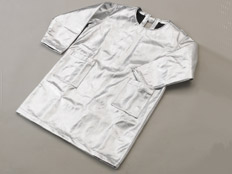 耐炎繊維織物とアルミ蒸着フィルムをラミネ ートした生地で加工した作業服です。 アルミ蒸着フィルムの影響で熱を反射し、 耐炎繊維生地の影響で防炎効果もあります。